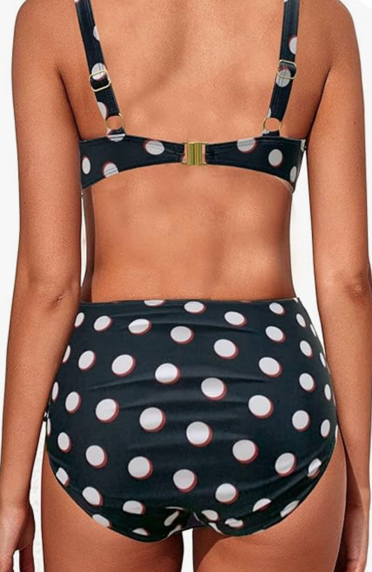 High Waist Bikini Set. Push Up Halter Top with Twisted Ruched Polka dot Printed Bottoms