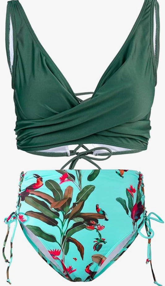 DOULAFASS Women Racer Back Bikini Top with V Cross High Waisted Bottom Mesh Swimsuit Two Pieces Swimwear