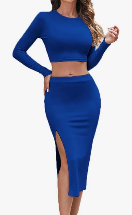 Women's 2 piece long sleeve crew neck ribbed crop top and bodycon slit midi skirt - Blue