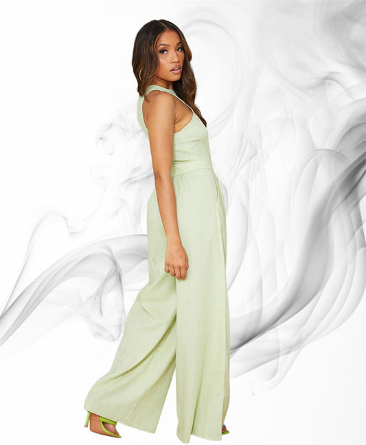 Prettylittlething Petite Sage Green Racer Neck Linen Look Wide Leg Jumpsuit