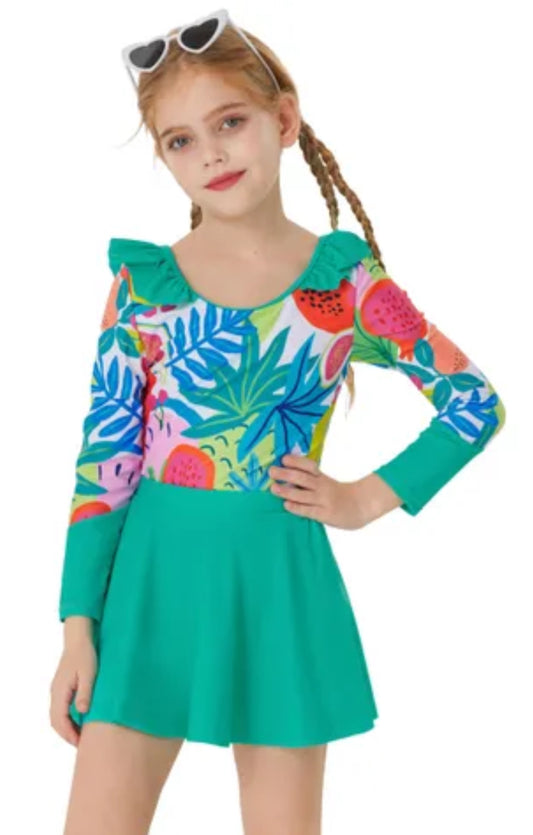 GRACE KARIN Long Sleeve Ruffle Floral Bathing Swimsuit with Skirt