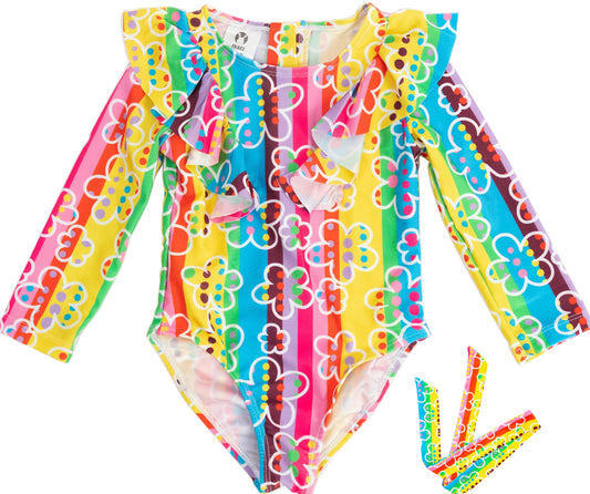 Girls One-Piece Rainbow Stripes Swimwear Headband Set