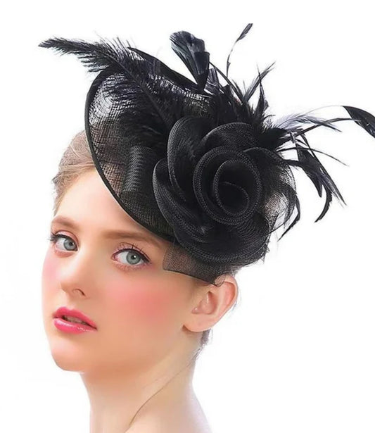 Ladies Fascinator Hat with Flower, Mesh and Feathers on a Headband and a Forked Clip