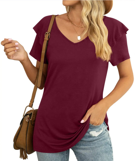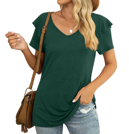 Casual V Neck Double Layered Ruffle Short Sleeve Top