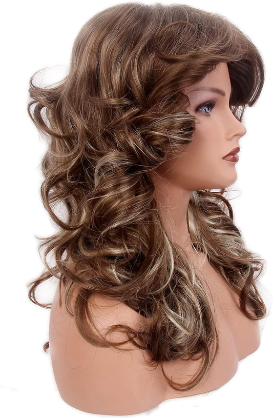 Reewes 70's Style Long Feathered Wig - Brown with Highlights