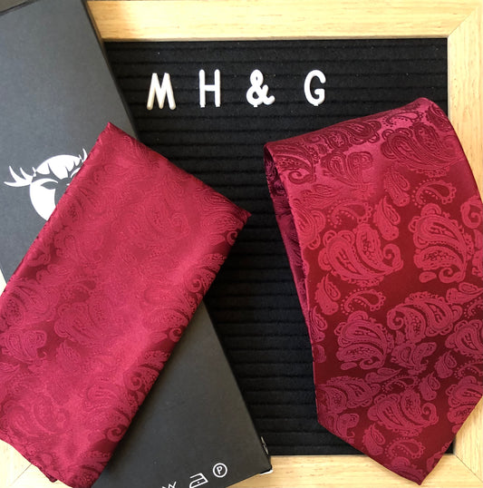 Ohlimuc Men's Paisley Tie and Pocket Square - Wine Red