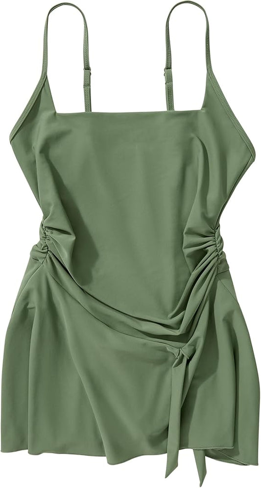 Women's Square Neck Swim Dress with Adjustable Straps and Knot Front Tummy Control